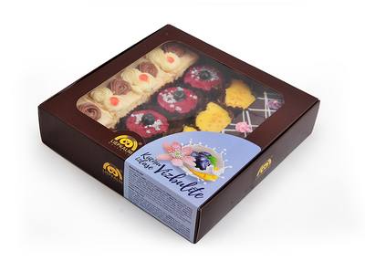 Four types of small-sized cakes arranged in the box – light and chocolate sponge cakes with custard and cherry filling, cakes with boiled condensed milk cream, blueberry cream cakes and mango cream cakes. Each cake is like a work of art, where the flavours of chocolate, cherry, blueberry, mango and sweet cream play together.