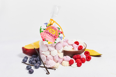 A selection of small, playful marshmallows made in Liepkalni. One package contains four types of miniature marshmallows: raspberry, blackcurrant, vanilla, and mango. Handmade!