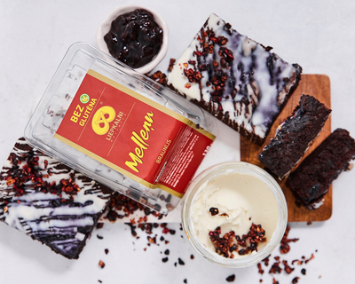 Ingredients: gluten-free brownie mix (sugar, cocoa powder, potato starch, palm oil, whey powder, dextrose, egg white powder, E450, drinking soda, emulsifier E471, salt, thickener E415), wild blueberry filling (36%) (wild blueberries, glucose-fructose syrup, modified starch, acidity adjuster E331iii, natural flavouring), chocolate cream (sugar, palm fat, rapeseed oil, skimmed milk powder, glucose syrup, cocoa butter, emulsifiers: E472a, sunflower lecithin; flavouring), rapeseed oil, eggs, black currants (freeze-dried).