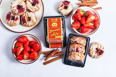 Treat yourself to our Gluten-free Strawberry Doughnut – bursting with juicy strawberry flavour, coated in a tempting chocolate/cinnamon glaze, and topped with crunchy cherry pieces. Baked, not fried in oil, for soft and guilt-free indulgence with a delightful mix of flavours.