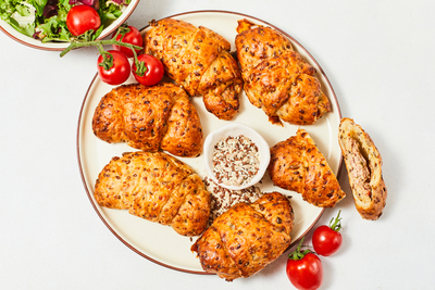 When preparing a pie with smoked chicken, we added tasty seeds to the dough, giving it a special rich flavor. The filling consists of chicken gyros, with sunflower, sesame, and flax seeds added to the dough.