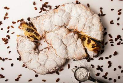With a rich raisin filling and decorated with thick crumbs. Made in the shape of a pretzel.