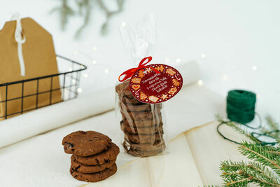 Paciņā kārtoti 9 cepumi, pievienots daudzsološs sveiciens - Ziemassvētki dara tā: 9 cepumus liek Jaunā gada kabatā!