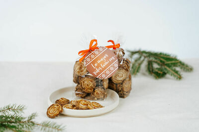 Paciņā likti kārtainie cepumi ar rudzu pilngraudu miltiem un klijām - Apaļās podziņas - sastāvā dzērveņu ievārījums, kanēlis un piparkūku garšvielas - kanēlis, krustnagliņas, ingvers, smaržīgie pipari, kardemons, melnie pipari. Pievienots vēlējums - lai mazais rūķis laimi nes!