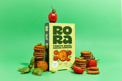 Protein-rich cheese cookies, inspired by Mediterranean flavours — combining real cheese with fragrant basil and tomato seasoning for a crunchy, savoury bite.