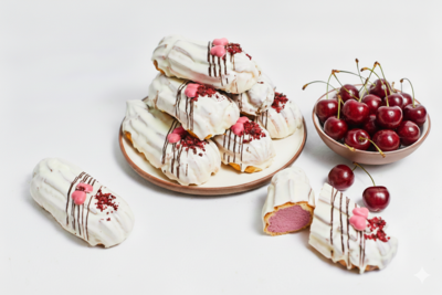 The cherry éclair is like a sweet moment of lightness and love – airy, elegant and created to delight. The delicate dough filling hides cherry cream and juicy berries, covered with light chocolate to create a festive mood.
