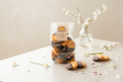 Oliņas formas mutē kūstoši saldi smilšu mīklas cepumi, kas bagātīgi pārklāti ar tumšās šokolādes glazūru un rotāti ar krāsainām cukura pērlītēm.