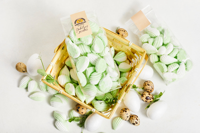 Firmas veikalu plauktos sastapsi jaunas gardumpaciņas - gaisīgi maigos pūkainos ābolu Bezē pumpuriņus, kas gatavoti no ābolu biezeņa, bez mākslīgām krāsvielām.