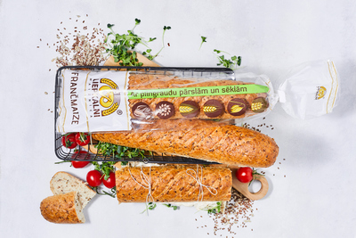 Elegant-shaped wholegrain wheat bread for making small sandwiches or nutrient-rich French sandwich. This bread is enriched with flakes of rye, wheat, oat and barley whole grains, and flour made of wheat whole grains, and therefore, this bread is full of fibre. Its taste is complemented by sunflower seeds and linseeds.