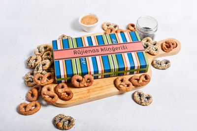 In the box, there are two types of butter dough based pretzels crafted by skilled bakers of the Bakery “Liepkalni“. Each pretzel is handmade, and therefore they are particularly curvy and tempting. This box of pretzels would make a wonderful present and a sweet souvenir from Rūjiena.