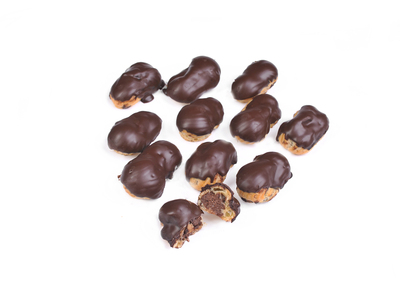 Pâte à Choux dough cakes filled with cream/chocolate cream, iced with dark chocolate
