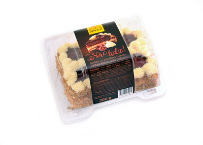 Cake "Nāc līdz!" with white and chocolate biscuit, custard cream and cherry filling. Packed in a beautiful box!