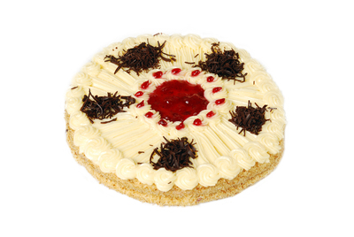 Biscuit layers, filled with custard cream and fresh raspberries. Decorated with cream.